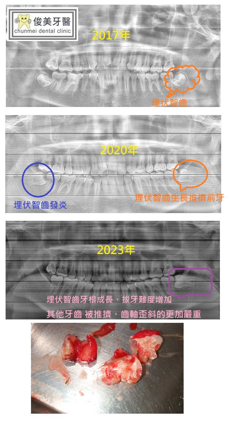 2017年患者已被檢查出,有埋伏智齒,加上患者本身牙齒已經擁擠,所以當時醫師已建議需拔除智齒,只是因為當時年紀較小,家長想要緩一緩.....