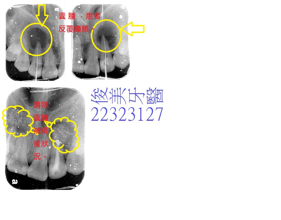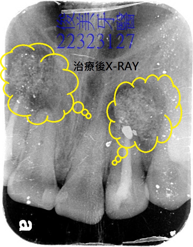患者當即同意,當天即將根管沖洗乾淨,並充填,交代患者需服藥,安排摘除囊腫及補骨時間。