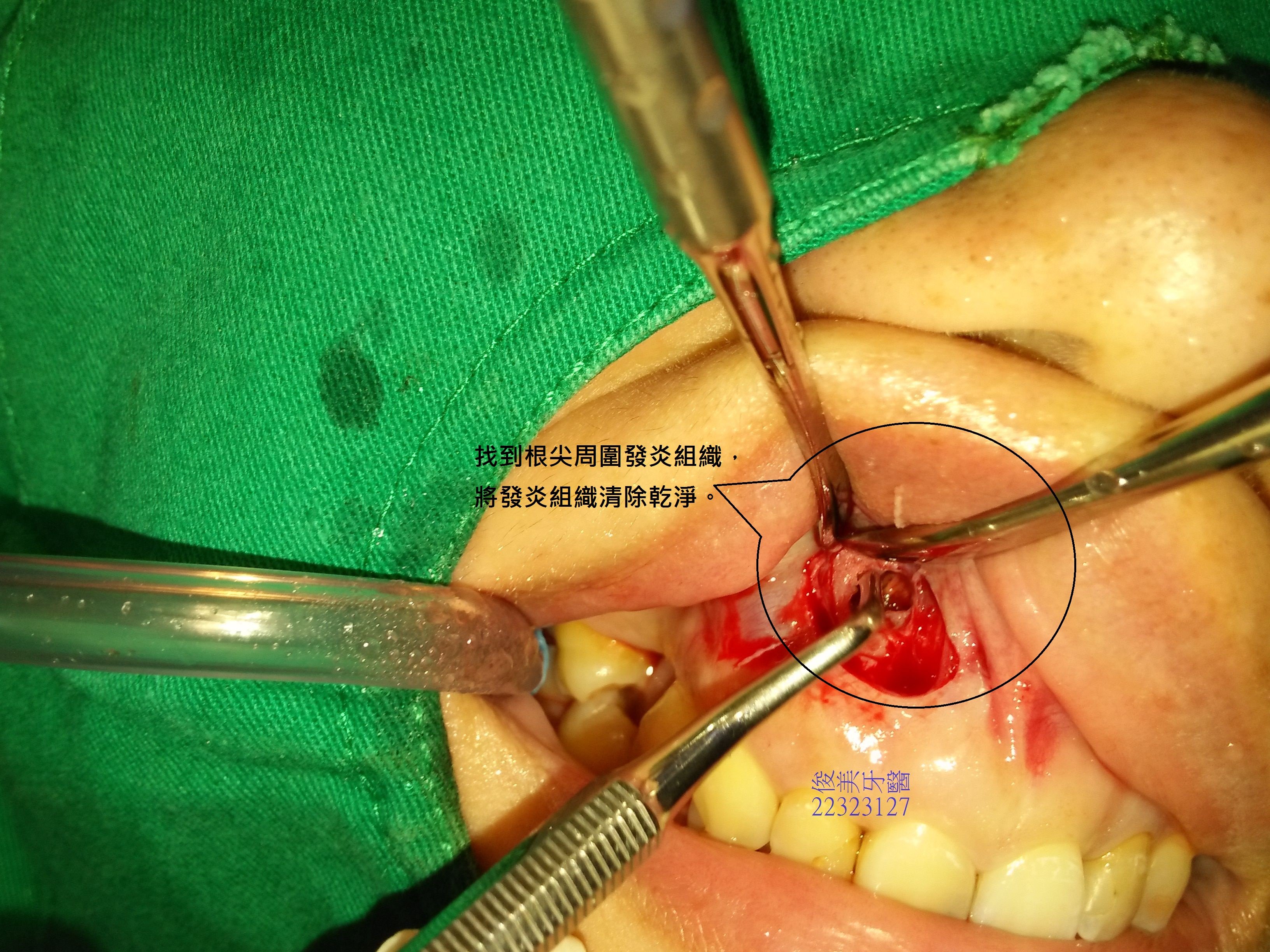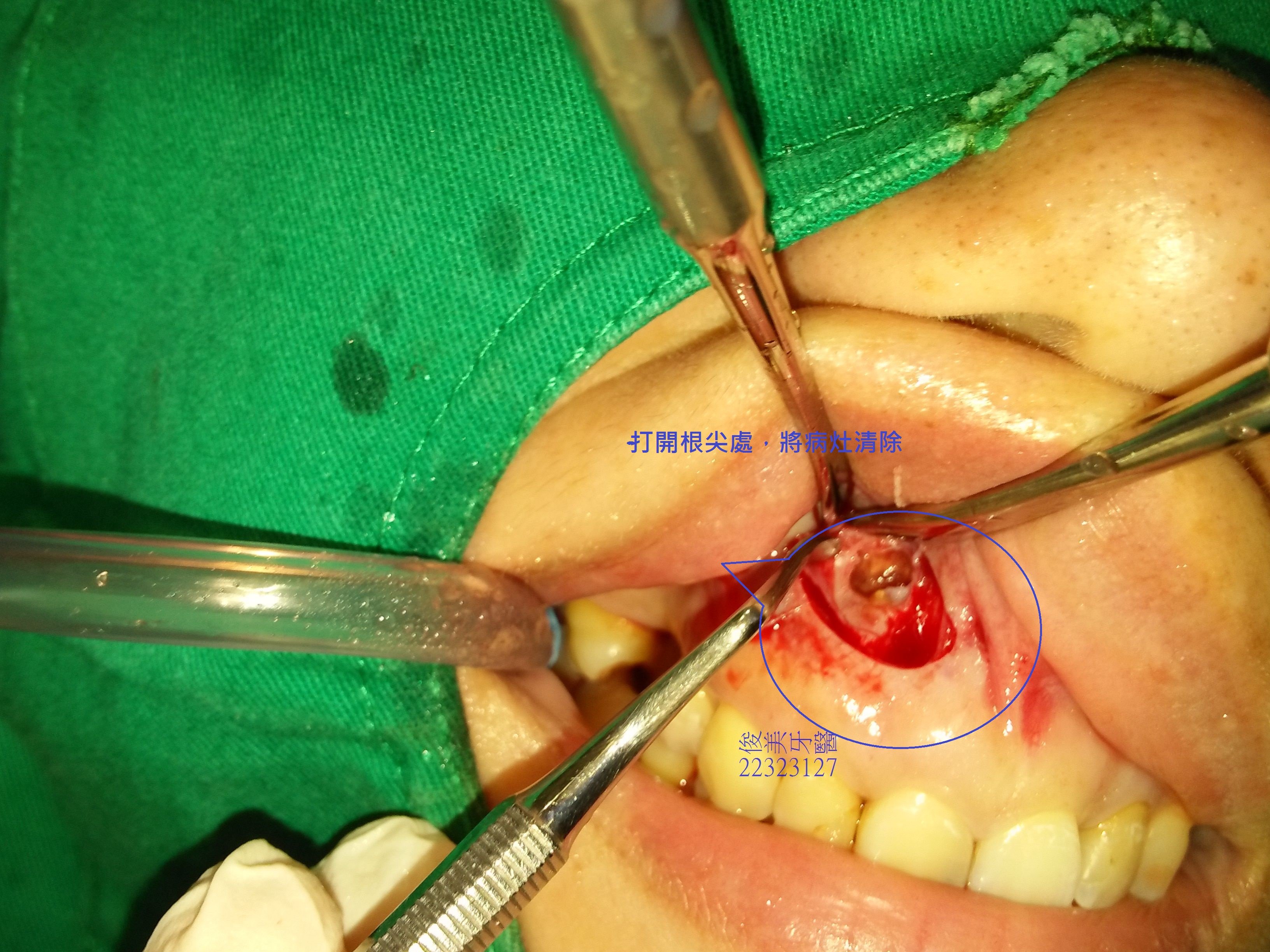安排治療時間後,醫師根據X光片診斷根尖有囊腫,所以單純做根管治療是不可能將病灶解除的,並開類似實例讓患者瞭解,除根管治療外,尚需做根尖切除、補骨,才能使病灶根治,並讓牙齒保留下來可繼續使用。