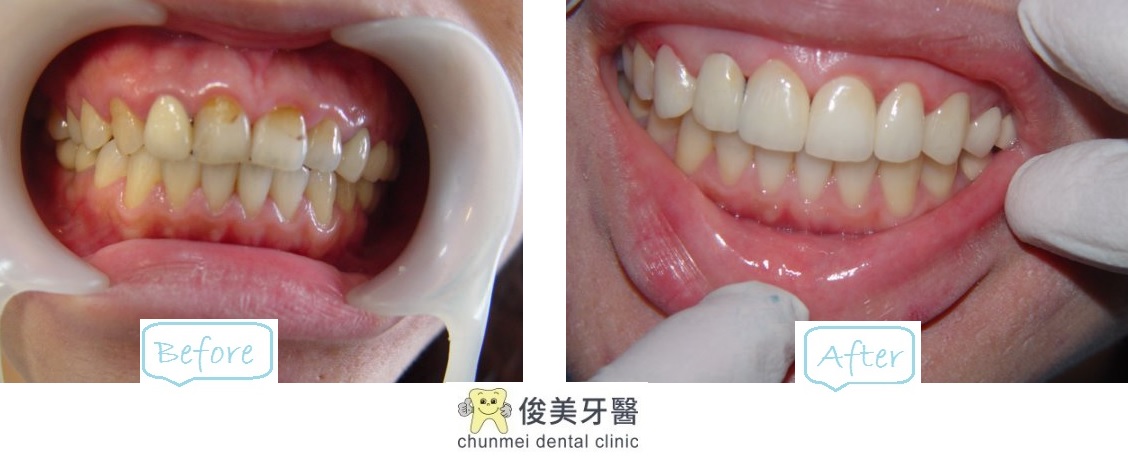 將原本舊的傳統瓷牙套拆除,改用全瓷牙套取代,並設計微笑曲線搭配前牙