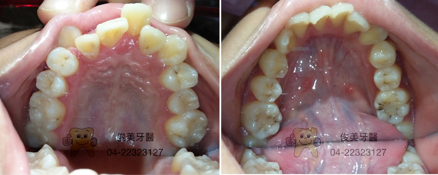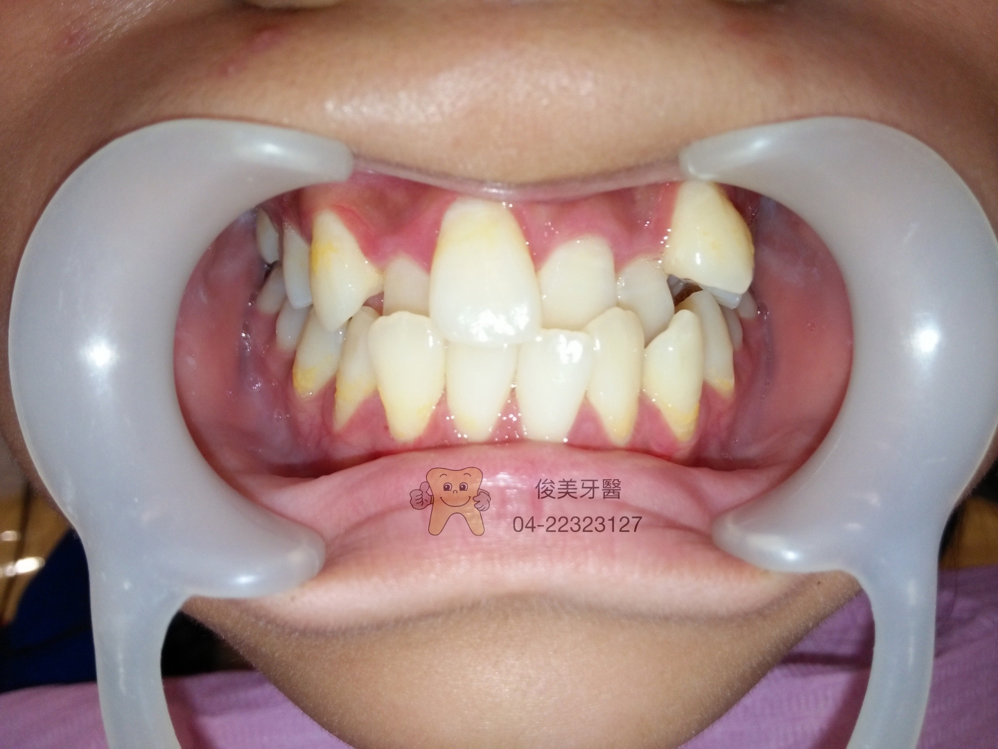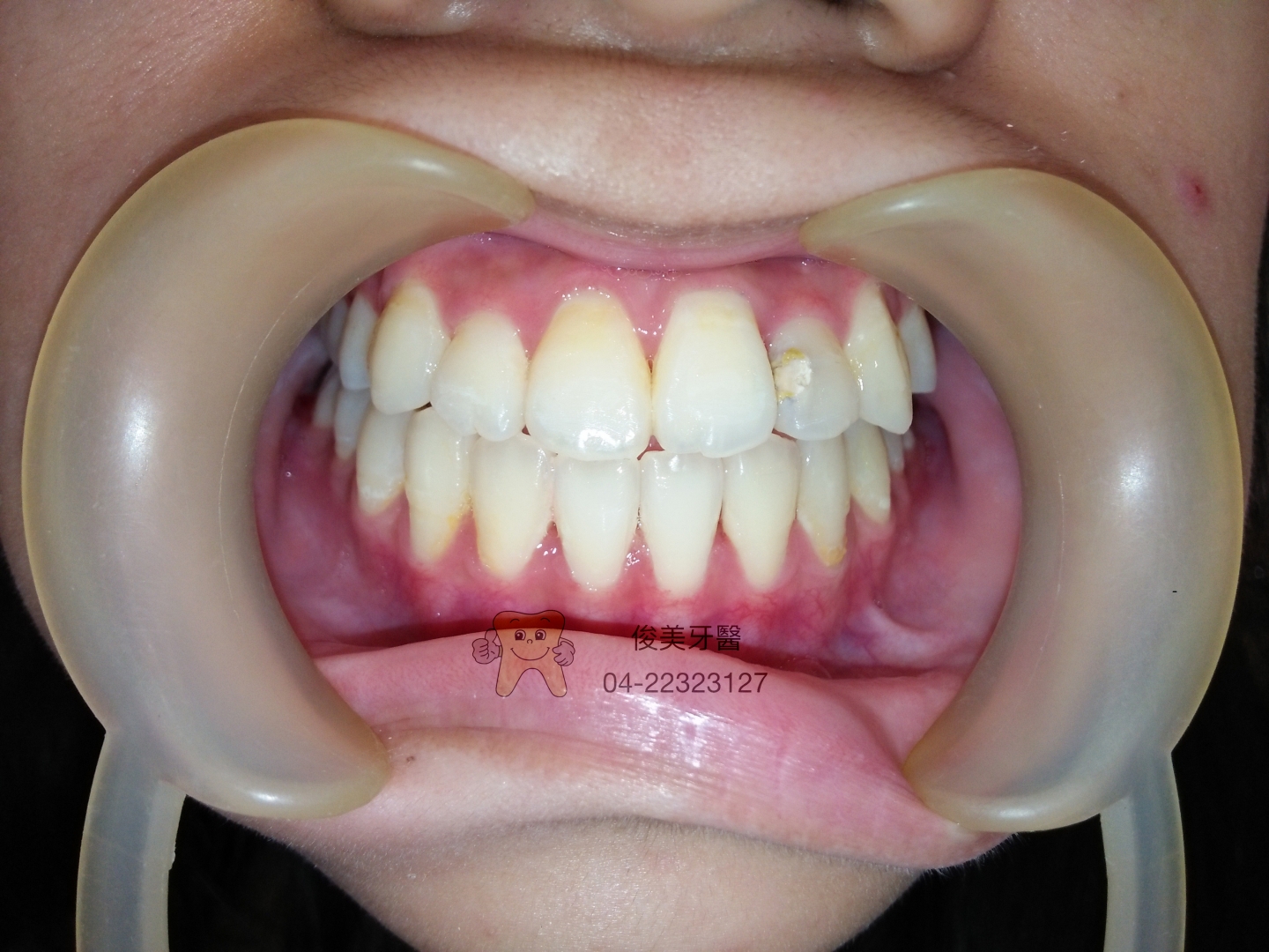 患者原始狀況。牙齒重疊,牙齦有點紅腫,牙齒頸部刷不乾淨。