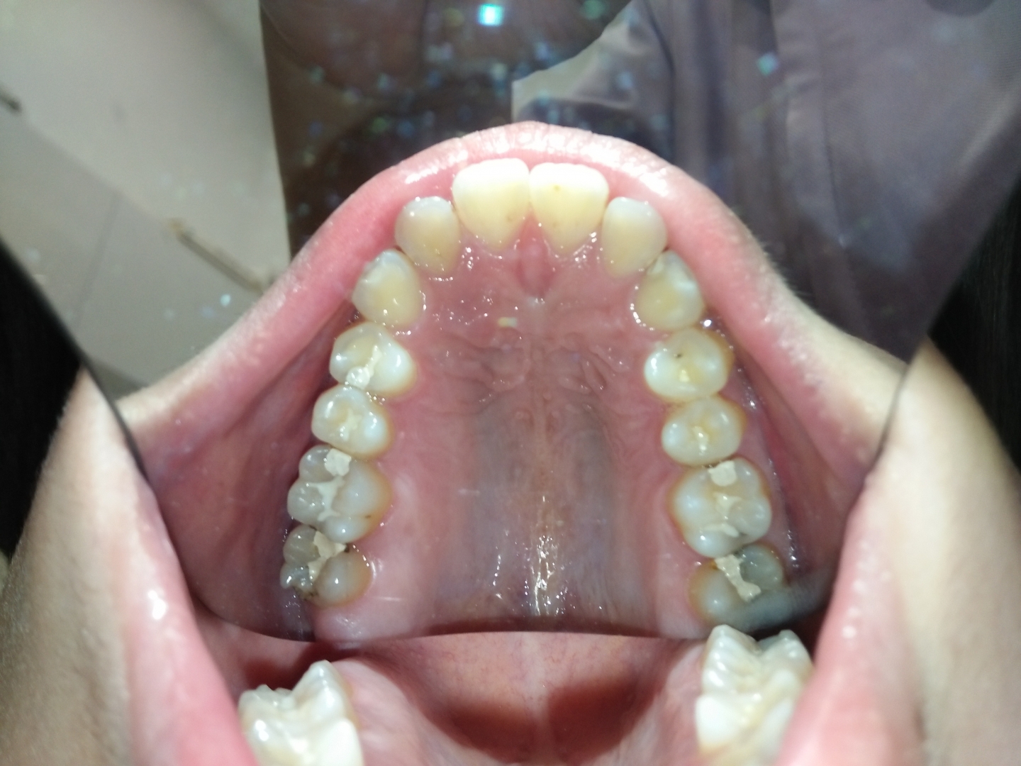 患者年約19歲,於門診中表示要檢查蛀牙,醫師已於之前檢查時告知家長,患者因咬合不正,造成牙縫易塞,容易造成蛀牙及將來